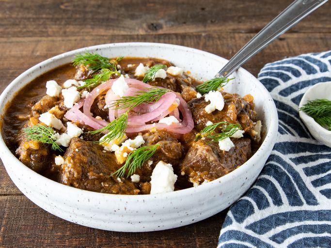 Tender beef and sweet shallots in a tangy, aromatic sauce make my version of beef stifado one you’ll surely want to try! Be sure to serve it with crusty bread to dip in the sauce. Top the stew with crumbled feta and pickled red onions.