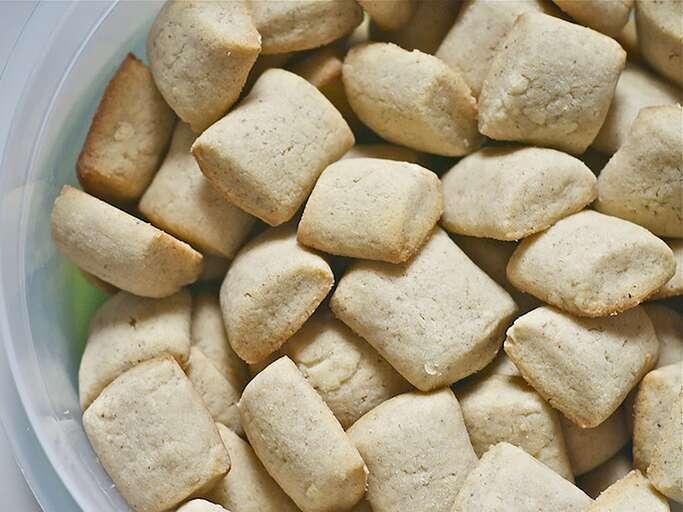 - Separate dough into 6 balls, and roll each ball into a rope about as big around as your finger on a lightly floured surface. Cut into 1/2-inch pieces, and place them on an ungreased baking sheet.